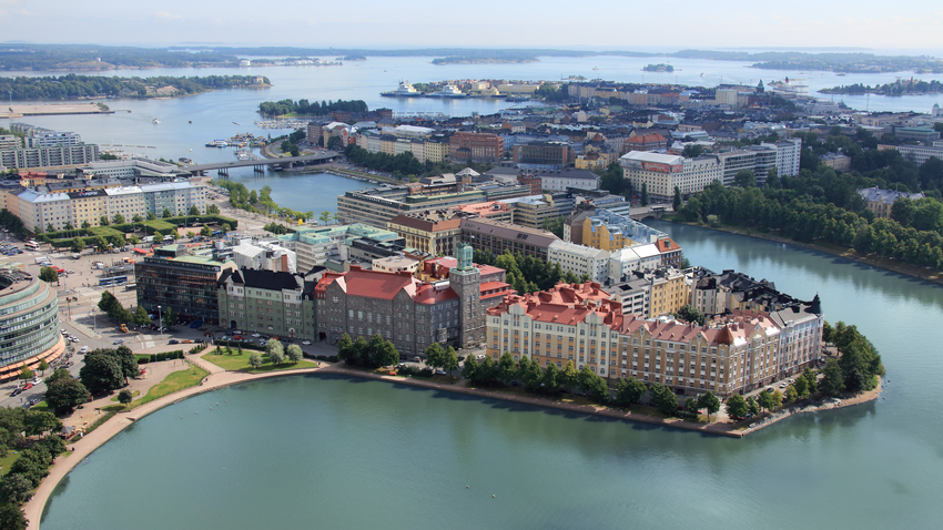 Aerial view of Helsinki Congress Paasitorni, surrounded by water, colorful buildings, and cityscape under a clear blue sky.