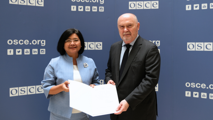 H.E. Pattarat Hongtong, Ambassador and Permanent Representative of the Kingdom of Thailand to the OSCE, with the OSCE Secretary General Feridun H. Sinirlioğlu, Vienna, 17 March 2025.