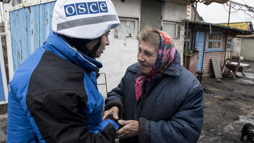 A person in an OSCE jacket interacts warmly with an elderly woman in a rural setting.