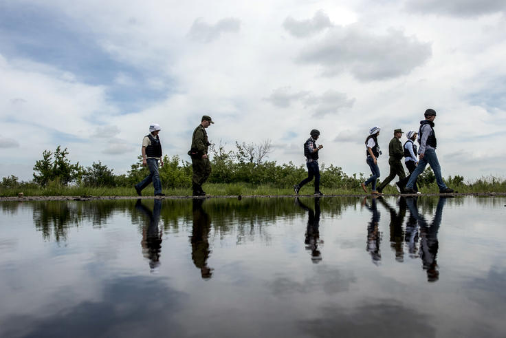 Monitors for the Special Monitoring Mission to Ukraine patrolling in Yasynuvata-Avdiivka area, in the Donetsk region.