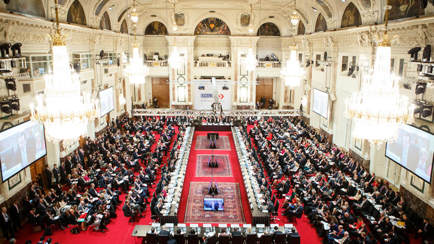 A grand conference hall with chandeliers, filled with delegates seated around long tables, attending an OSCE meeting.