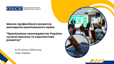 З метою підтримки професійного розвитку викладачів кримінального права закладів вищої освіти, Програма підтримки ОБСЄ для України у співпраці з Верховним Судом та у партнерстві з Національним юридичним університетом імені Ярослава Мудрого оголошує відбір учасників(ць) Школи професійного розвитку викладачів кримінального права "Кримінальне законодавство України: сучасні виклики та перспективи розвитку", яка відбудеться 8-10 лютого 2026 року в м. Києві.